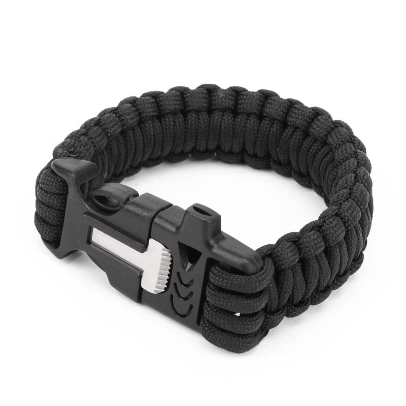 A rugged paracord bracelet crafted for outdoor and emergency use. It features durable seven-core cord, an integrated whistle and fire-starter buckle, and multipurpose rope utility for survival tasks like shelter building or gear repair. Ideal as an everyday carry accessory for adventurers and urban explorers.