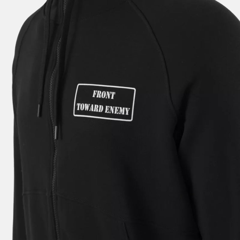 The Front Toward Enemy hoodie is a lightweight, full-zip streetwear piece with adjustable hood and two hip pockets. Made from a durable cotton/polyester blend, it pairs tactical inspiration with everyday comfort, ideal for casual wear or layering in urban settings.