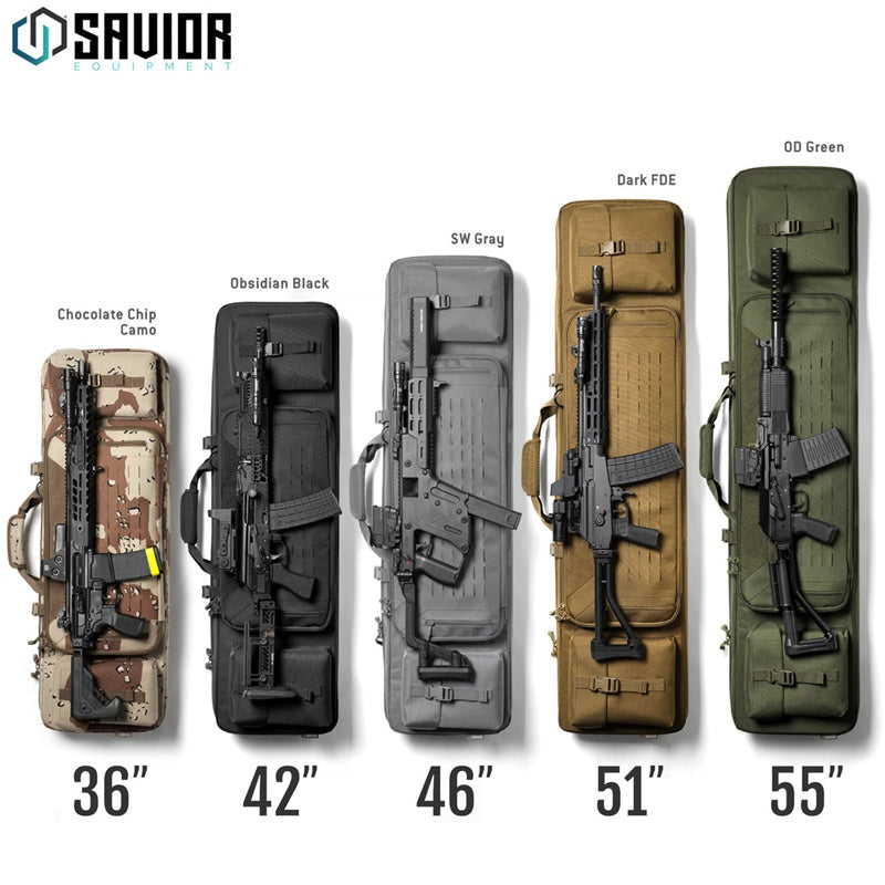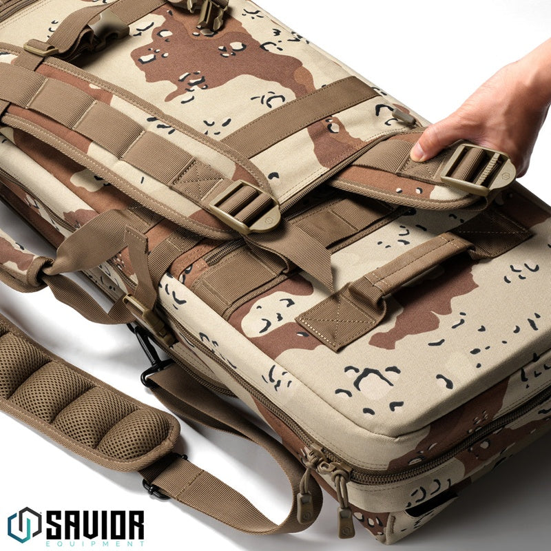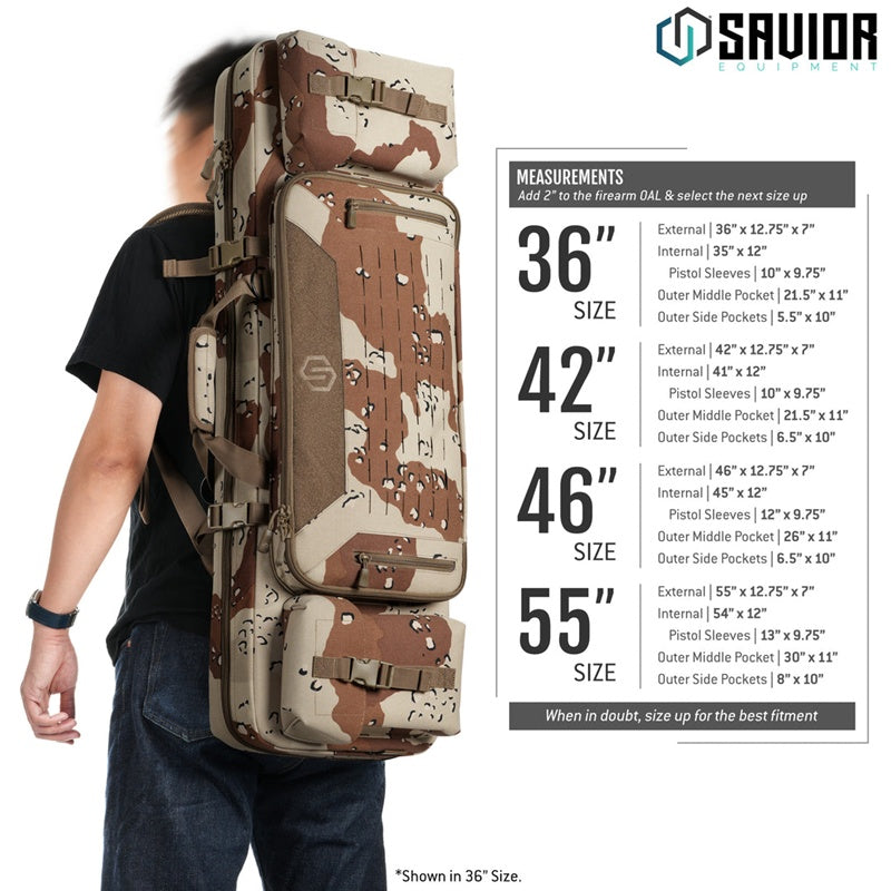 Stand out at the range in all the right ways. The Savior Equipment Camo Urban Warfare Double Rifle Case is the second generation fan favorite now wrapped in classic camo patterns. Padded dual rifle slots, full length removable divider, two padded pistol sleeves, lockable zippers and removable backpack straps included.
