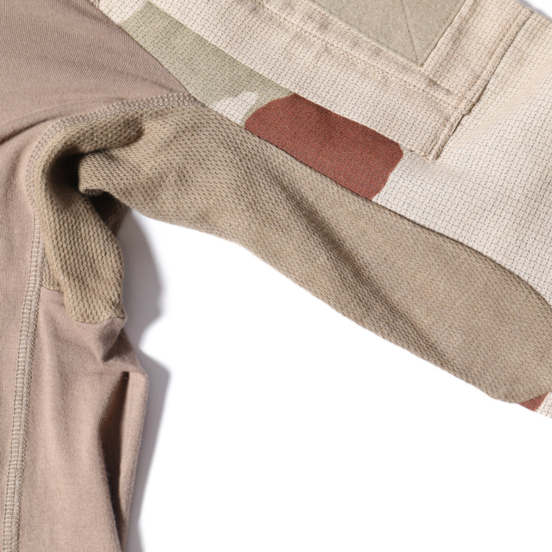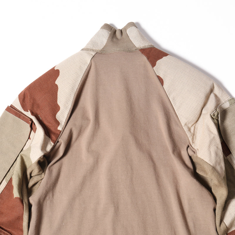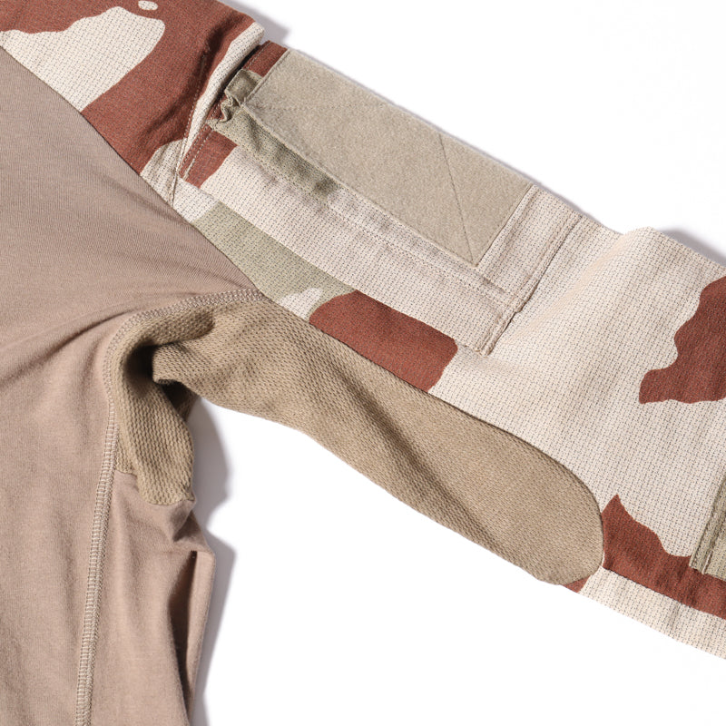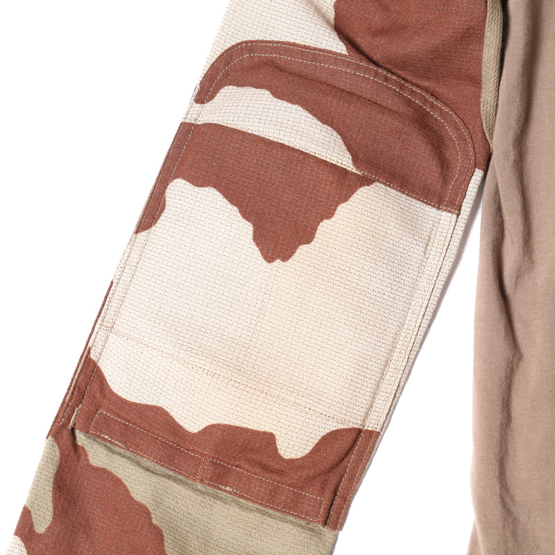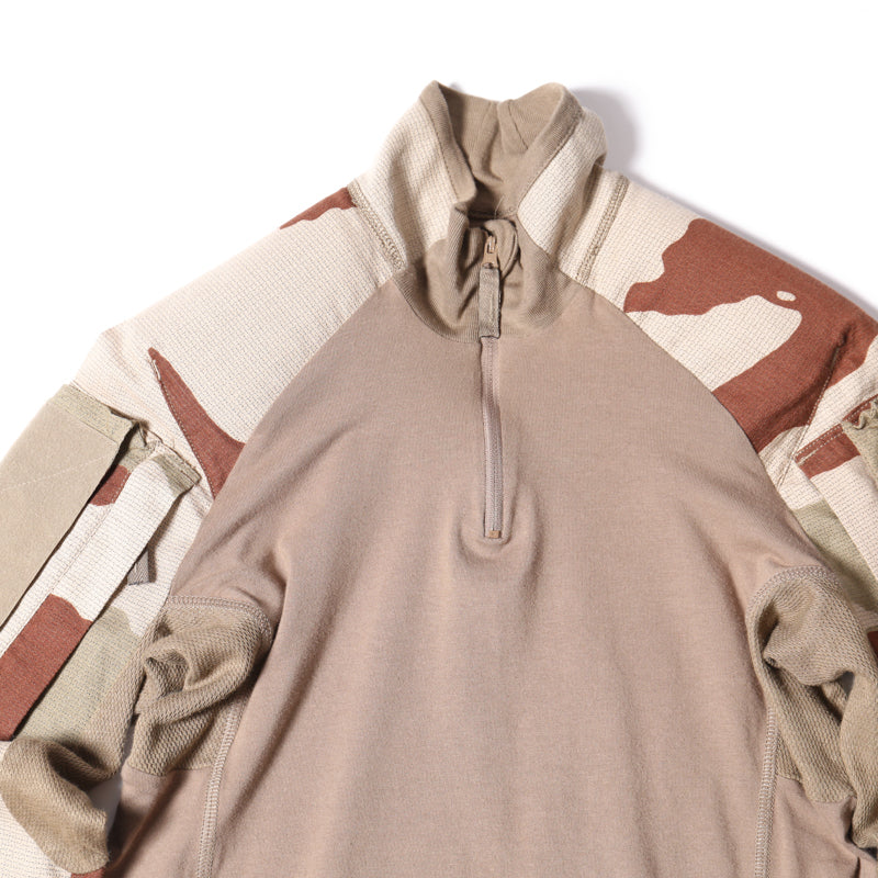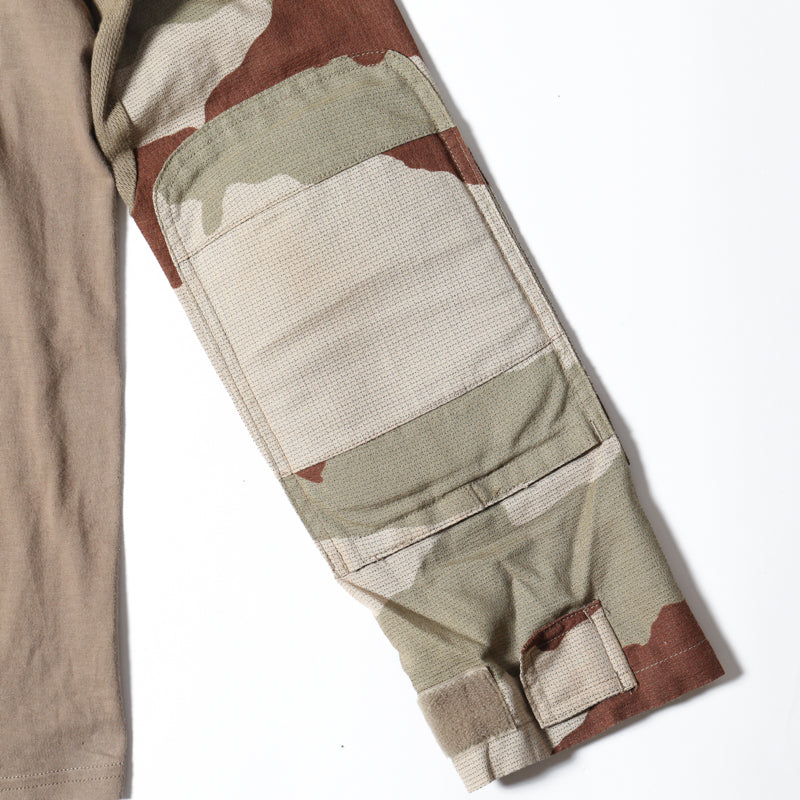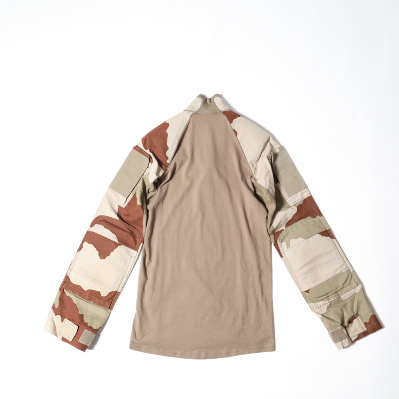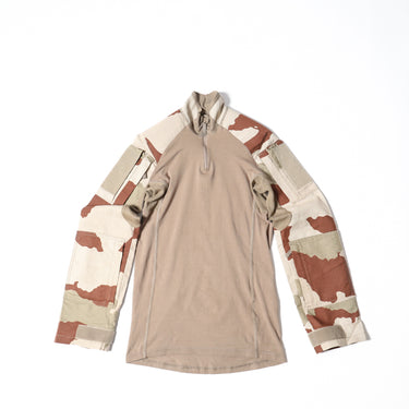 French Military UBACS shirt in camouflage with moisture-wicking torso and durable sleeves. Features zip-neck collar, reinforced elbows, and adjustable cuffs. Designed for comfort, protection, and mobility under body armour in tactical environments.