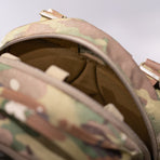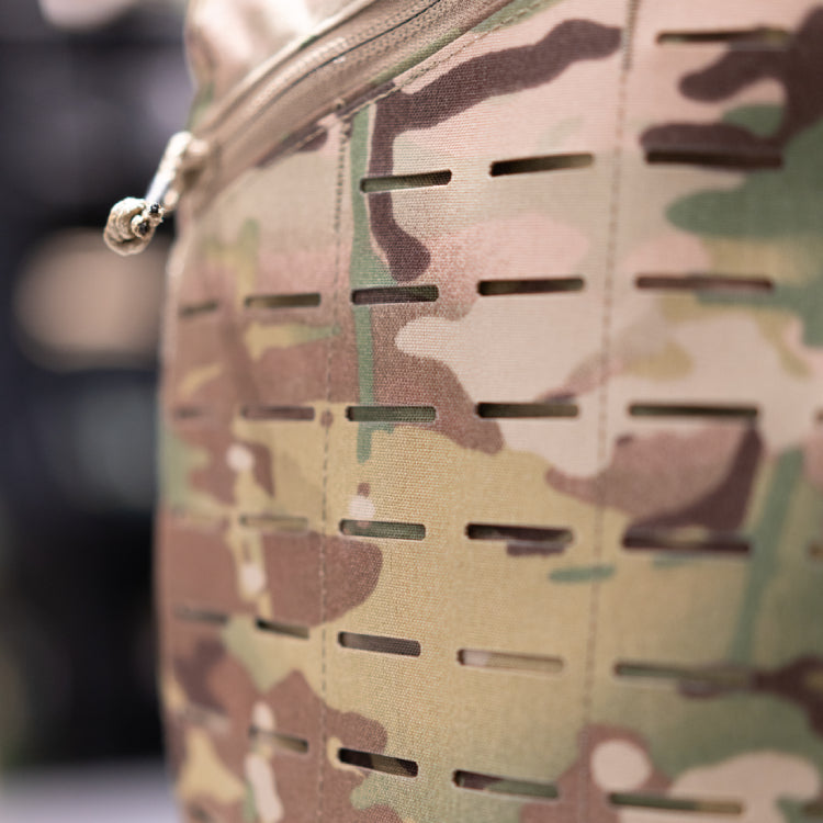 Laser cut Squadron panel on shoulder straps for sternum strap routing and MOLLE attachments.