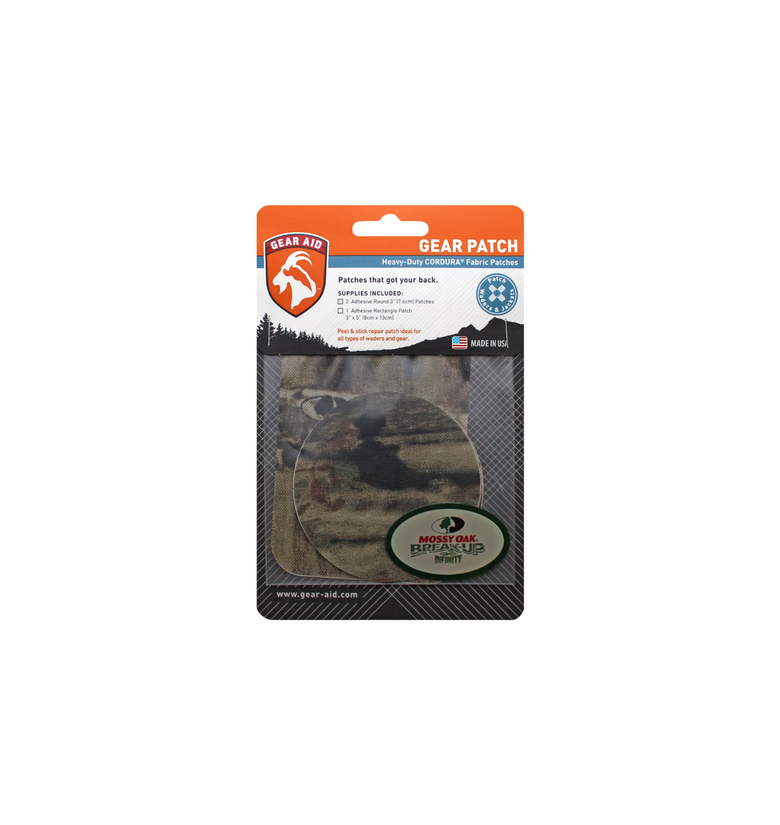'When camouflage gear gets damaged, you need a repair patch that won't stick out and is guaranteed to last. Cordura fabric patches by Gear Aid offer an invisible solution perfect for field or home repairs. These long-lasting camouflage repair patches utilize an abrasion and tear resistant 500 denier Cordura fabric. Featuring an ultra strong adhesive that bonds to almost any surface, the patches can be applied in field with finger pressure to instantly repair waders, Camo Clothing and outdoor gear. At home, Iron on the repair patch to increase bond strength and wear life. With two, 3 "Circular patches and a 3" "x 5" rectangular patch that can be cut to size, you're sure to find the shape you need for most any hole, rip or tear. Available in Realtree Max-4 , Realtree AP Camo and mossy oak break up infinity, Cordura fabric patches by Gear Aid are the long-lasting solution to camo repairs.