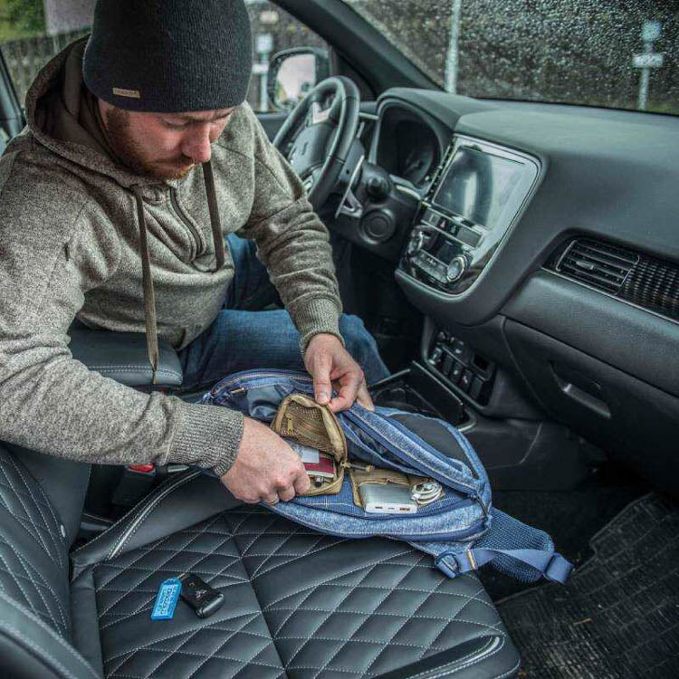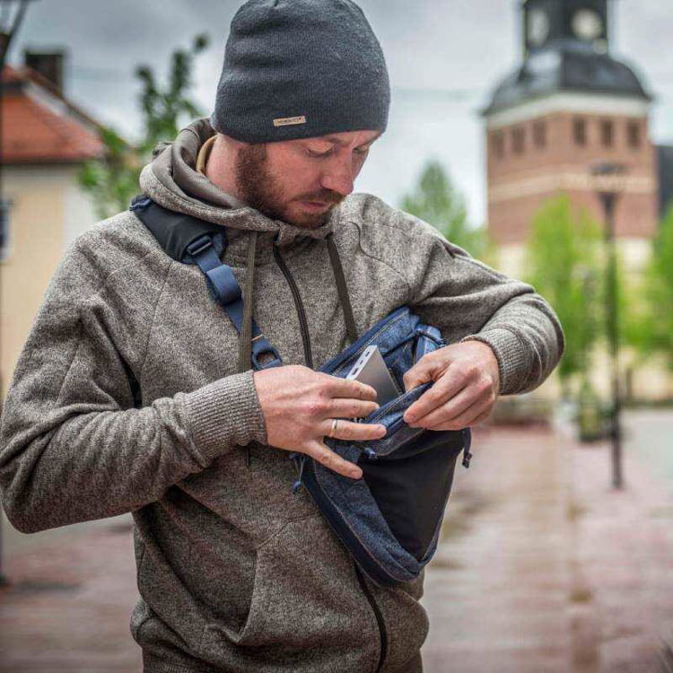 Compact yet versatile, this sling pack offers 6.5 L capacity in a slim Cordura/poly blend. It features velour-lined main and hidden compartments, a stretch front pocket, zippered strap pocket, and mesh-padded shoulder strap for ergonomic comfort.