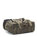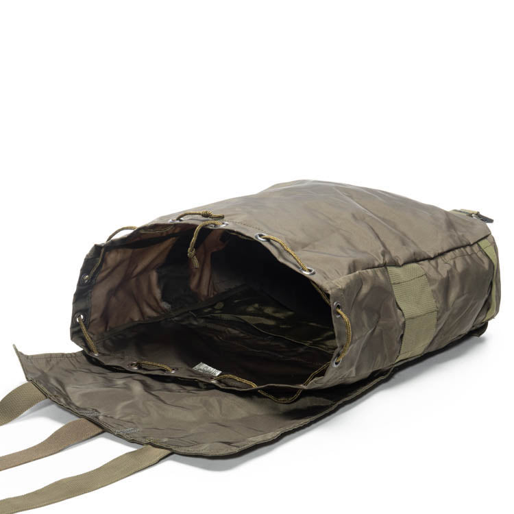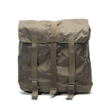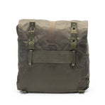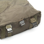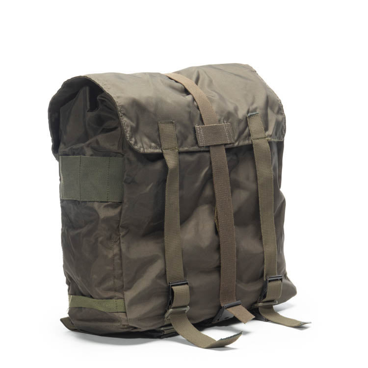 This Austrian Army Pilot Bag features a rugged olive drab nylon construction, designed for durability and field use. It has a large main compartment secured by two adjustable front straps with metal buckles and an additional central strap. Side panels include reinforced webbing for extra strength.