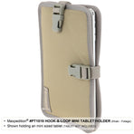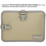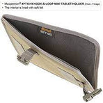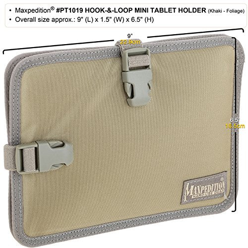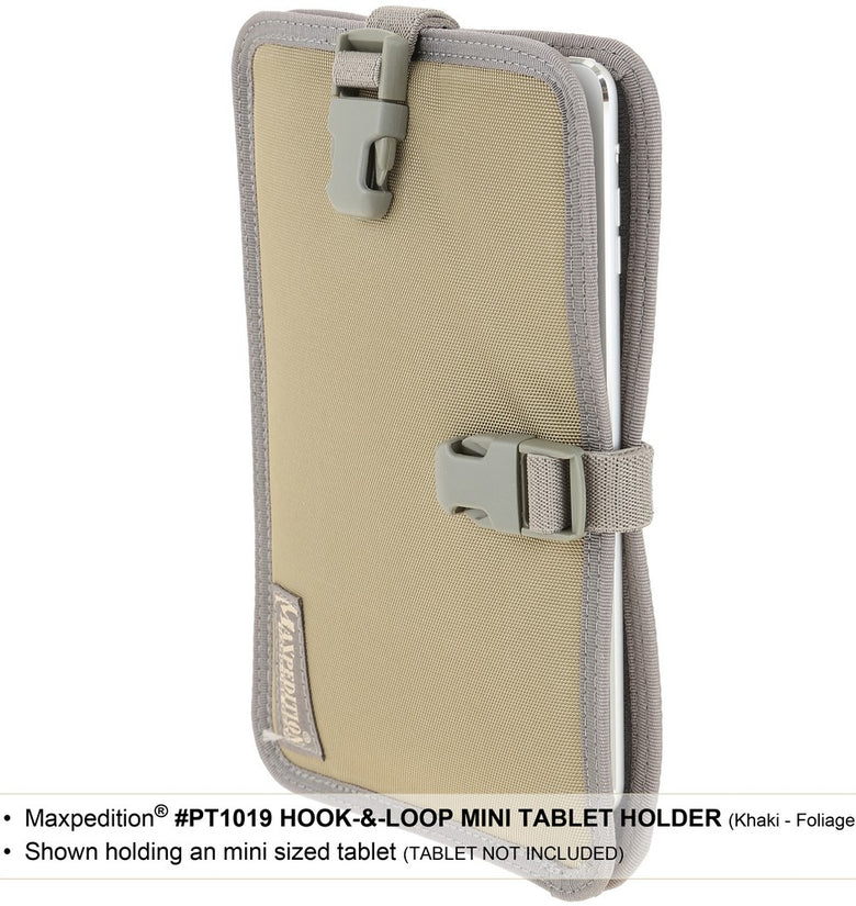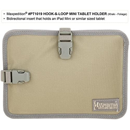 Holds the iPad Mini or similar sized tablet Product Features Overall size: 9" (L) x 1.5" (W) x 6.5" (H) Holds iPad Mini or similar sized tablet Fully padded and shock resistant Attaches to the loop field inside you larger Maxpedition bag Designed for vertical or horizontal placement and access Can be used in a variety of bags Need a larger size? #PT1020 Hook-&-Loop Tablet Holder also available Product Materials 1000-Denier water and abrasion resistant light-weight ballistic nylon fabric Teflon fabric protector for grime resistance and easy maintenance high strength zippers and zipper tracks Triple polyurethane coated for water resistance High tensile strength nylon webbing High tensile strength composite nylon thread (stronger than ordinary industry standard nylon thread) Internal seams taped and finished Paracord zipper pulls Stress points double stitched, Bar tacked or "Box-and-X" stitched for added strength Cleaning Instructions MAXPEDITION's nylon fabric is treated with DuPont Teflon for superb water and grime resistance. To clean, simply wipe down with a damp cloth. Allow gear to dry naturally. Do not machine wash. Do not use detergent or bleach.
