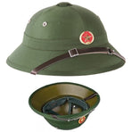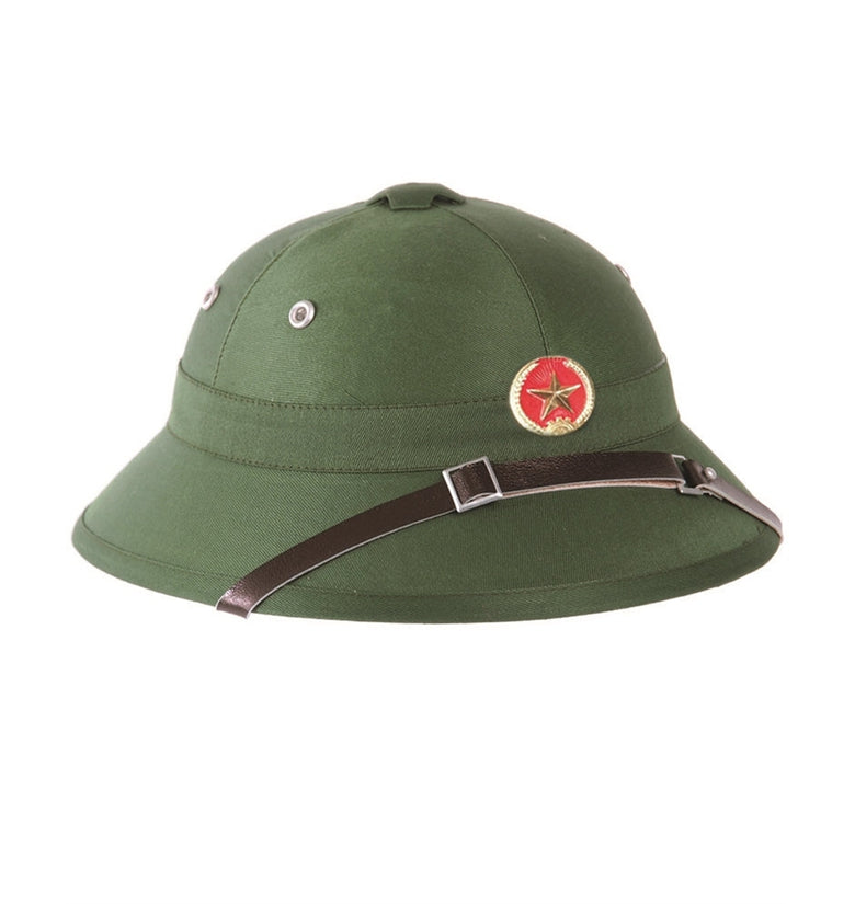 - Vietcong Pith helmet (replica) with leather strap and badge
